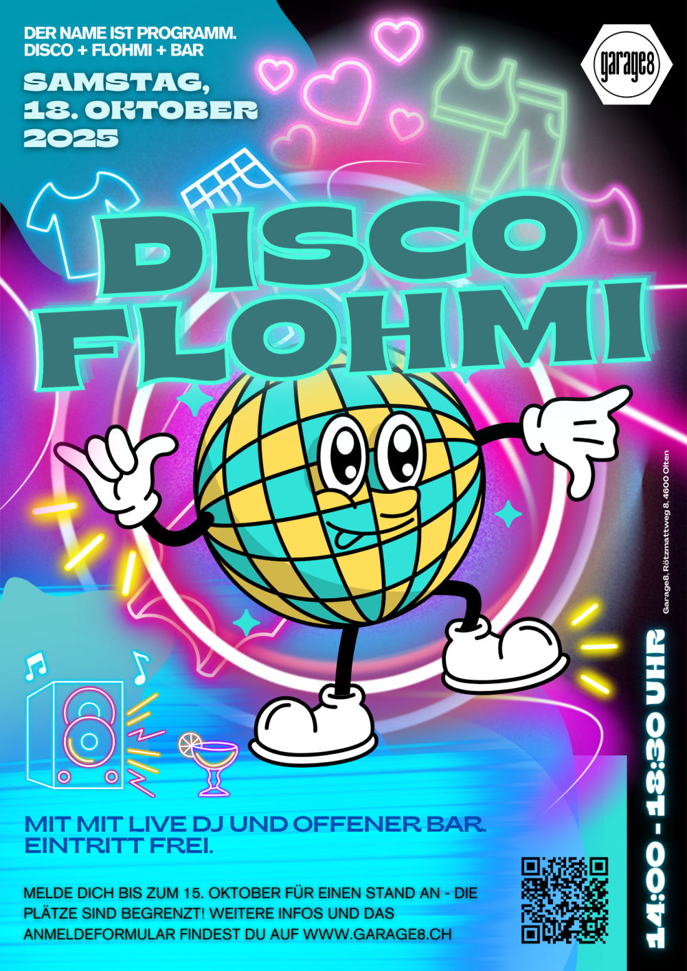 Am Samstag, 18. Oktober findet der Disco-Flohmi in der Garage8 zum ersten Mal in einem grösseren Format auf zwei Etagen statt. Der Eventsaal im EG wird mit live DJ bespielt und die Bar ist offen. Die ganze Fläche des 2.OG bietet ebenfalls viel Platz für eure Flohmi-Stände und gemütliches Zusammensein bei guter Musik.