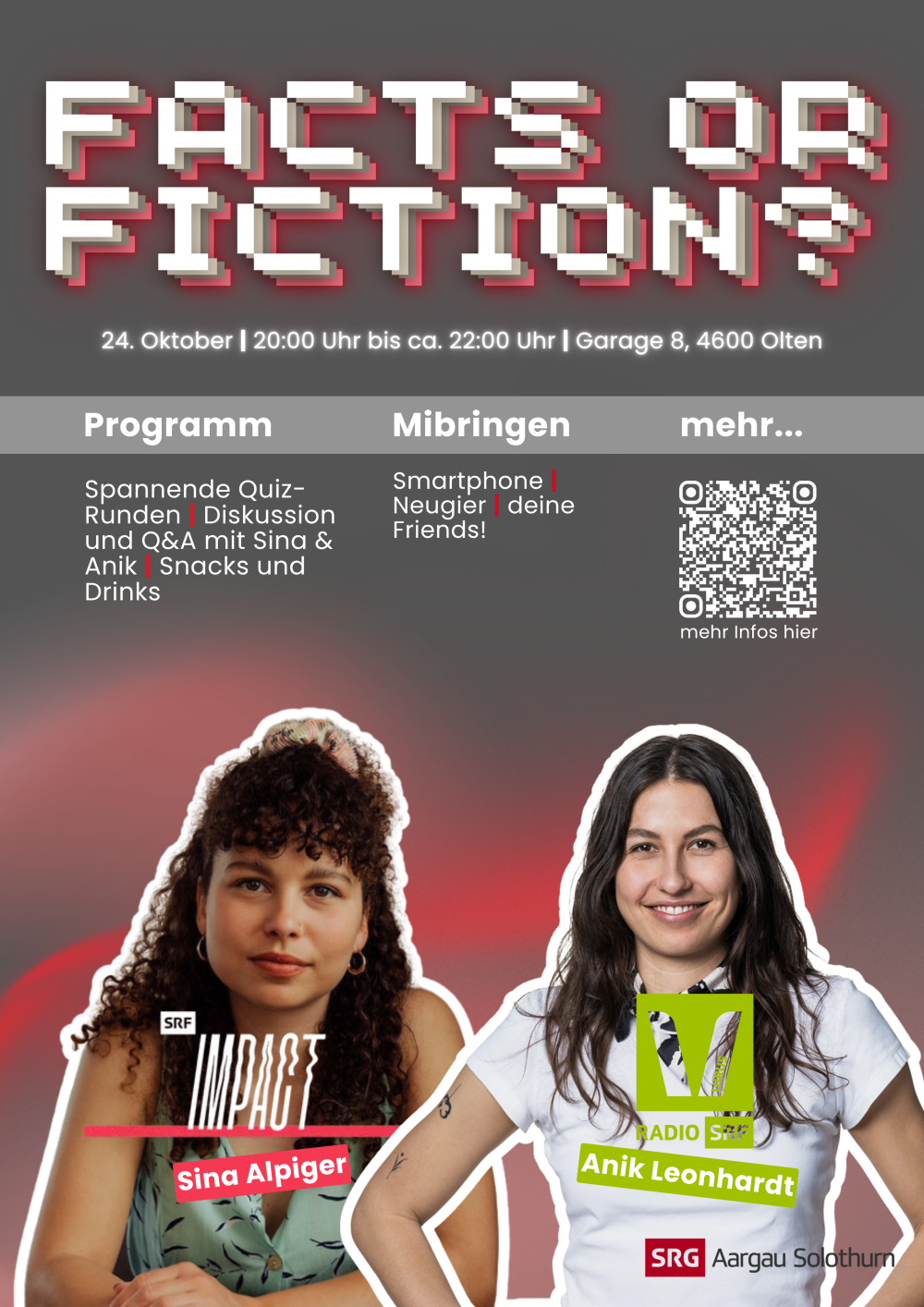 Dich erwartet ein abwechslungsreicher Abend mit Quiz, spannenden Diskussionen und einem Gespräch mit Anik Leonhardt (Moderatorin bei SRF Virus) und Sina Alpiger (Redaktorin bei SRF Impact), die Einblicke in den Redaktionsalltag geben und Tipps & Tricks im Umgang mit Fake News geben.