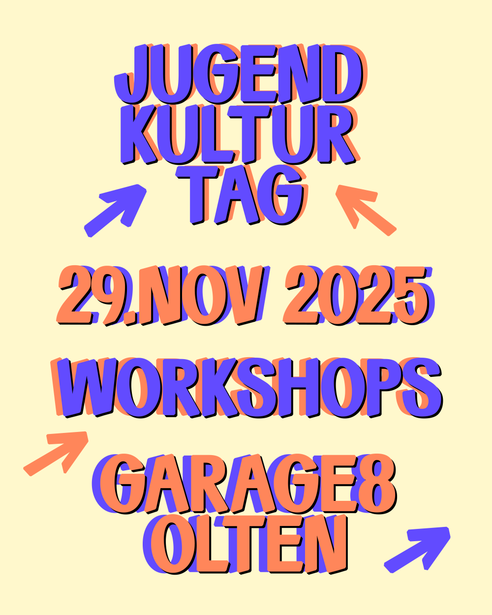 Der Jugendkulturtag Olten ist ein Angebot für Jugendliche und junge Erwachsene ab 15 Jahren. Die Teilnehmenden melden sich für einen der Workshops an und setzten sich dann einen ganzen Tag lang intensiv mit dem Thema auseinander. Die Workshops sind in zwei Blöcke aufgeteilt. Für das gemeinsame Zmittag sorgt das Team der Garage8. Den Abschluss des Tages feiern wir gemeinsam im Eventsaal der Garage8 – inklusive Auftritt unseres Surprise-Acts.